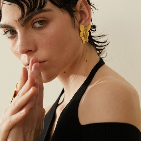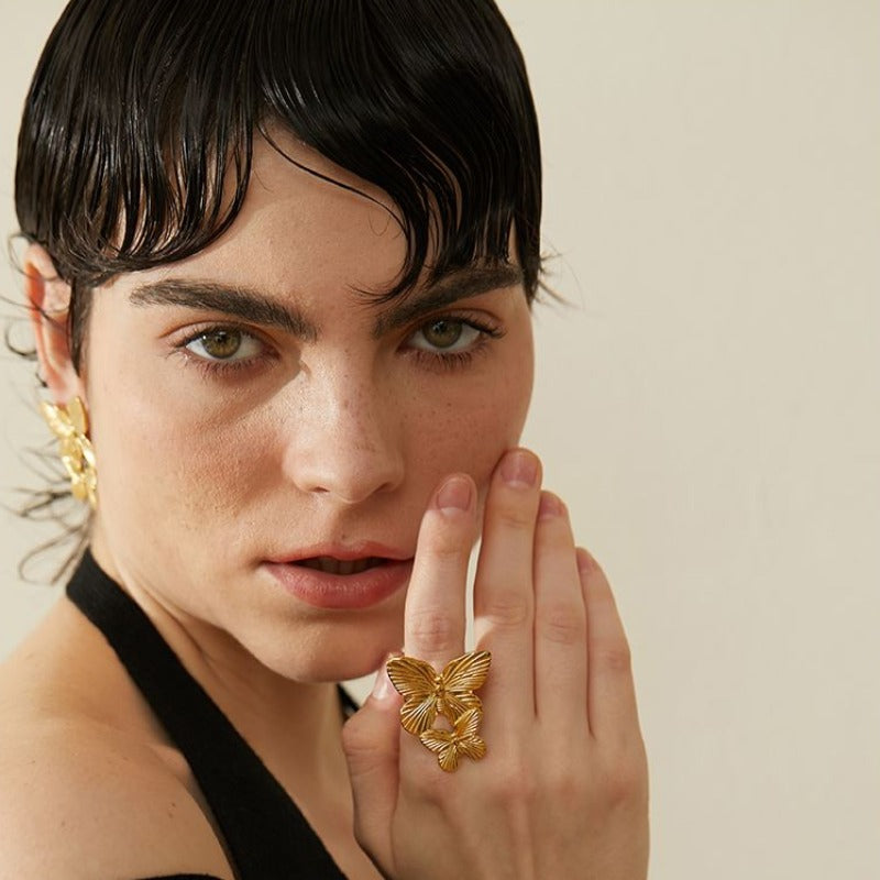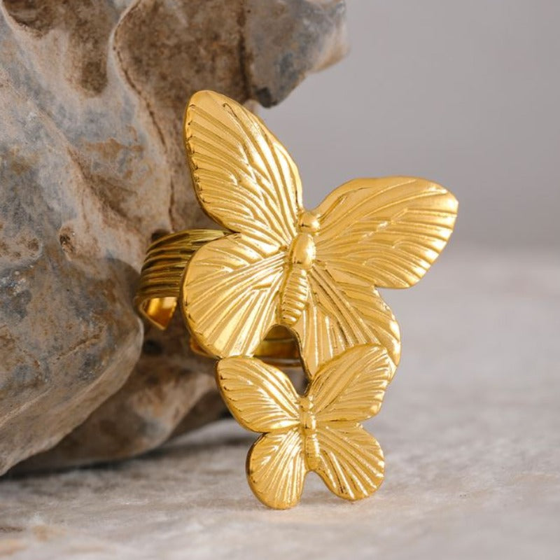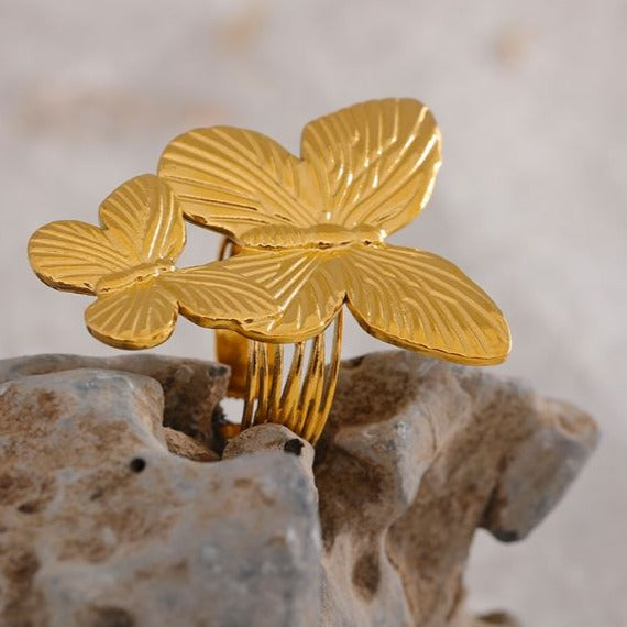 Two majestic butterflies spread their golden wings to create a piece of unparalleled elegance. This ring reflects the splendor of the butterfly, a symbol of transformation and beauty, in a golden hue that evokes sophistication. The meticulous details of the wings catch the light brilliantly, creating a spectacular display with every movement. Manufactured with precision and care, this ring adds a regal touch to your jewelry collection. Assert your style with this gold color butterfly ring that combines the grace of the butterfly with the richness of the color gold. Put your order in today for double-winged golden elegance.