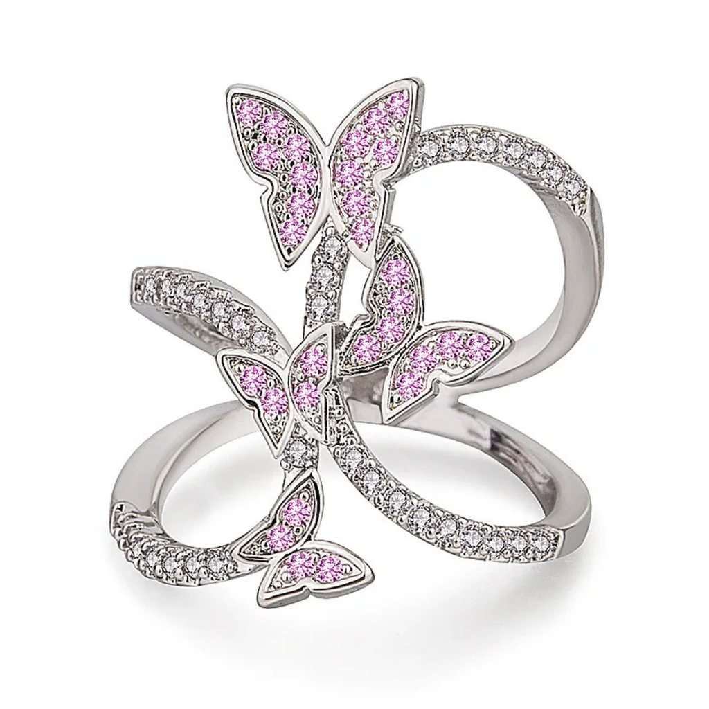 This ring is adorned with four delicate butterflies, each decorated with sparkling pink crystals. The body of the ring is itself a work of art, adorned with sparkling crystals that capture the light in a breathtaking way. Thoughtfully crafted from high-quality materials, this ring is a perfect fusion of butterfly symbolism and the irresistible sparkle of pink crystals. Every detail has been meticulously crafted to create a piece that incarnates elegance, beauty and infinite continuity. Affirm your style with this ring that combines sophistication and symbolism. Order this infinity butterfly ring today and let this unique creation brighten your everyday life.