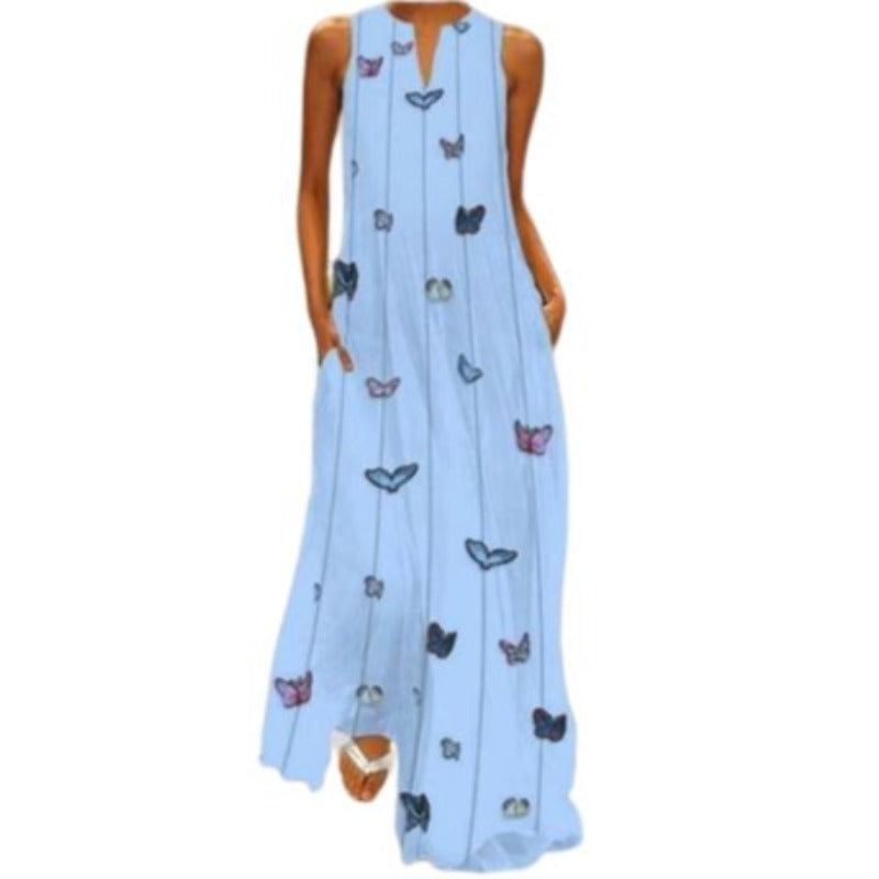 You won't go ignored with its modest yet functional design. The various colored butterflies that adorn this stunning outfit exude beauty and lightness. You'll be able to wear it to any event with confidence because it features a V-neckline and soft yet durable fabric. You may pair it with either lace-up shoes or heels. One thing is certain: you will look magnificent in this light blue butterfly dress.