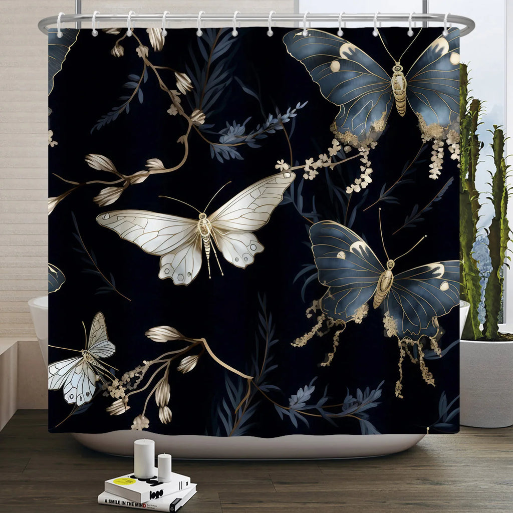 Escape into a world of mystery and sophistication with our Shower Curtain with Butterfly Pattern.