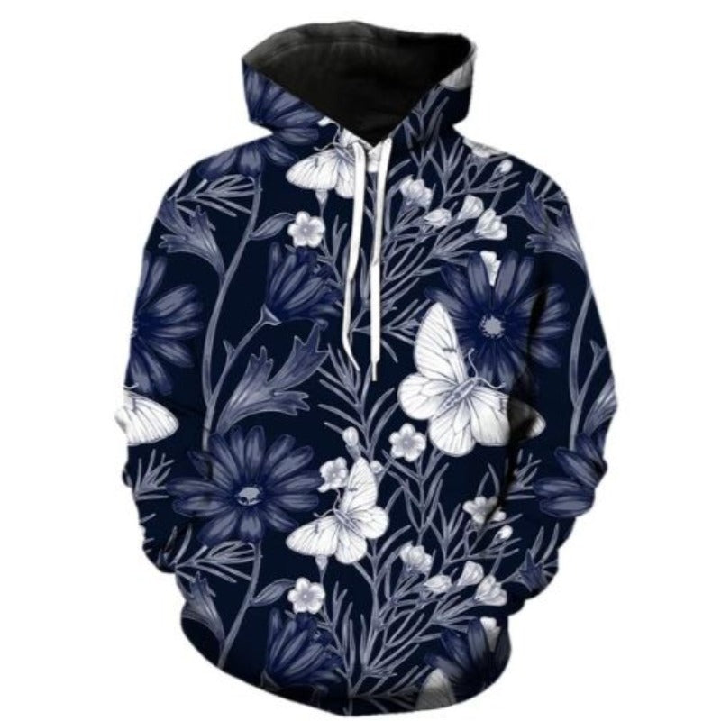 Frankly, this white and blue butterfly pullover is graceful. With a design like this, you're sure to impress everyone.